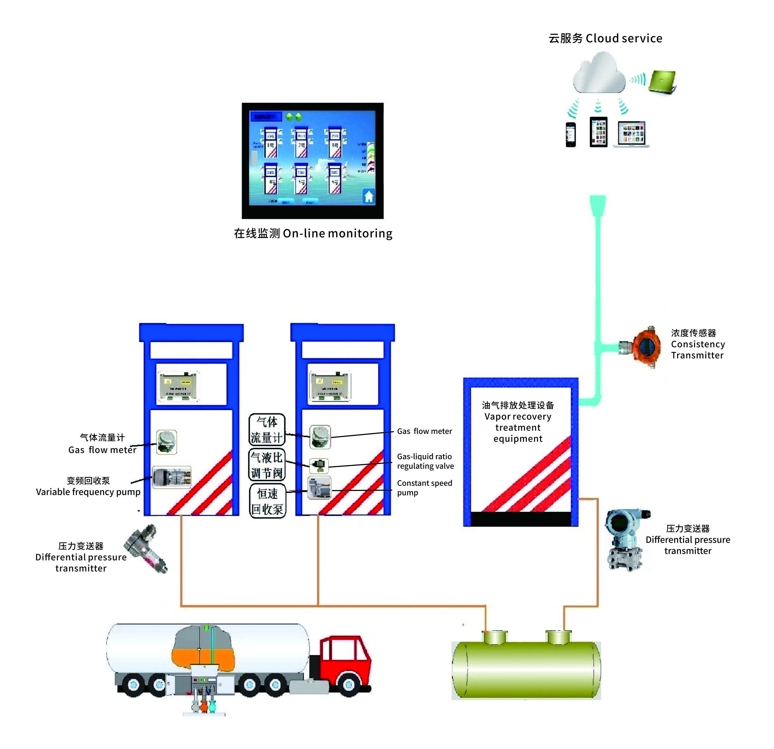 油氣回收在線監(jiān)測系統(tǒng):對卸油時是否連接回氣管、汽油加油槍氣液比、油氣回收系統(tǒng)壓力、油氣排放裝置是否處于正常狀態(tài)等4個指標(biāo)進行監(jiān)控,具備數(shù)據(jù)儲存、上傳和氣液比報警后自動關(guān)閉加油槍的功能。并具備油氣回收系統(tǒng)密閉性、油氣回收管線液阻的監(jiān)測功能。